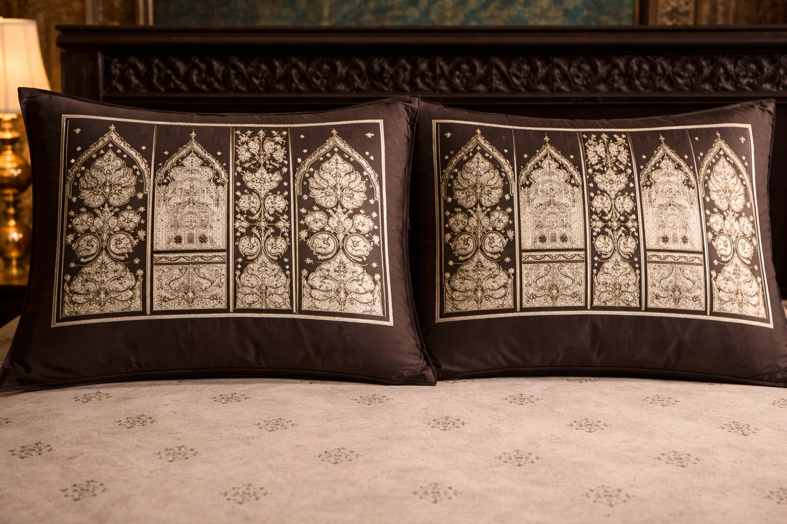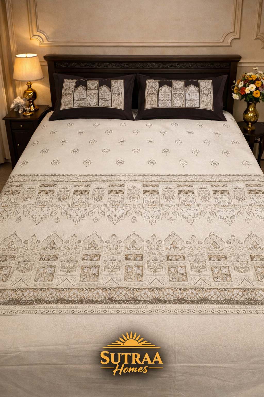 Inspired by the timeless elegance of royal Indian architecture, the Shahi Mehrab Ivory Heritage Luxury Double Bedsheet by Sutraa Homes™ reflects the beauty of intricate palace arches and ornamental motifs found in historic Rajput and Mughal structures. The design showcases delicately arranged architectural patterns along the border, reminiscent of the graceful archways and carved details seen in grand heritage palaces.